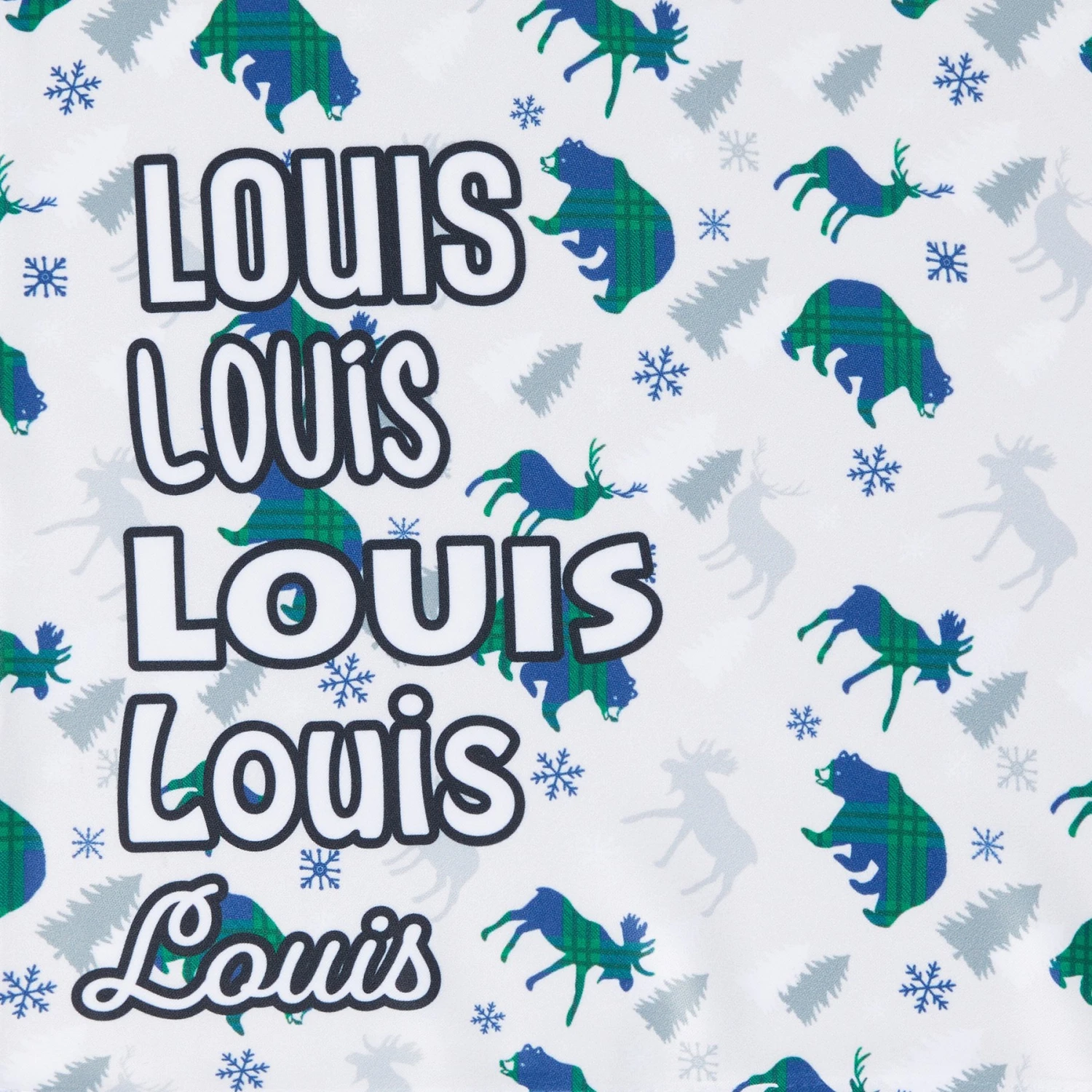 - Made of comfy polyester with a wintry pattern of moose, deer and bear silhouettes with blue-and-green plaid accents.