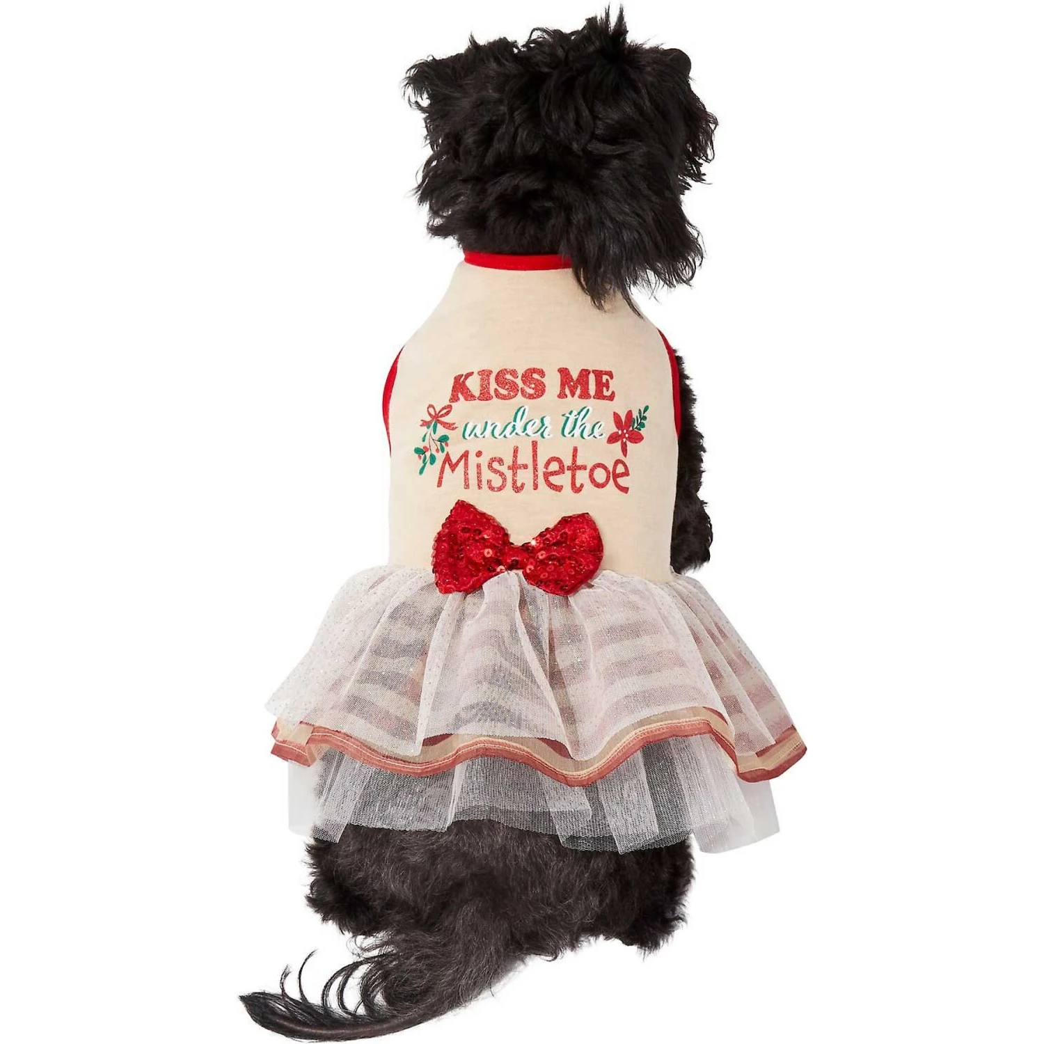 - Features a “Kiss Me Under the Mistletoe” graphic with holly and a red sequin bow.