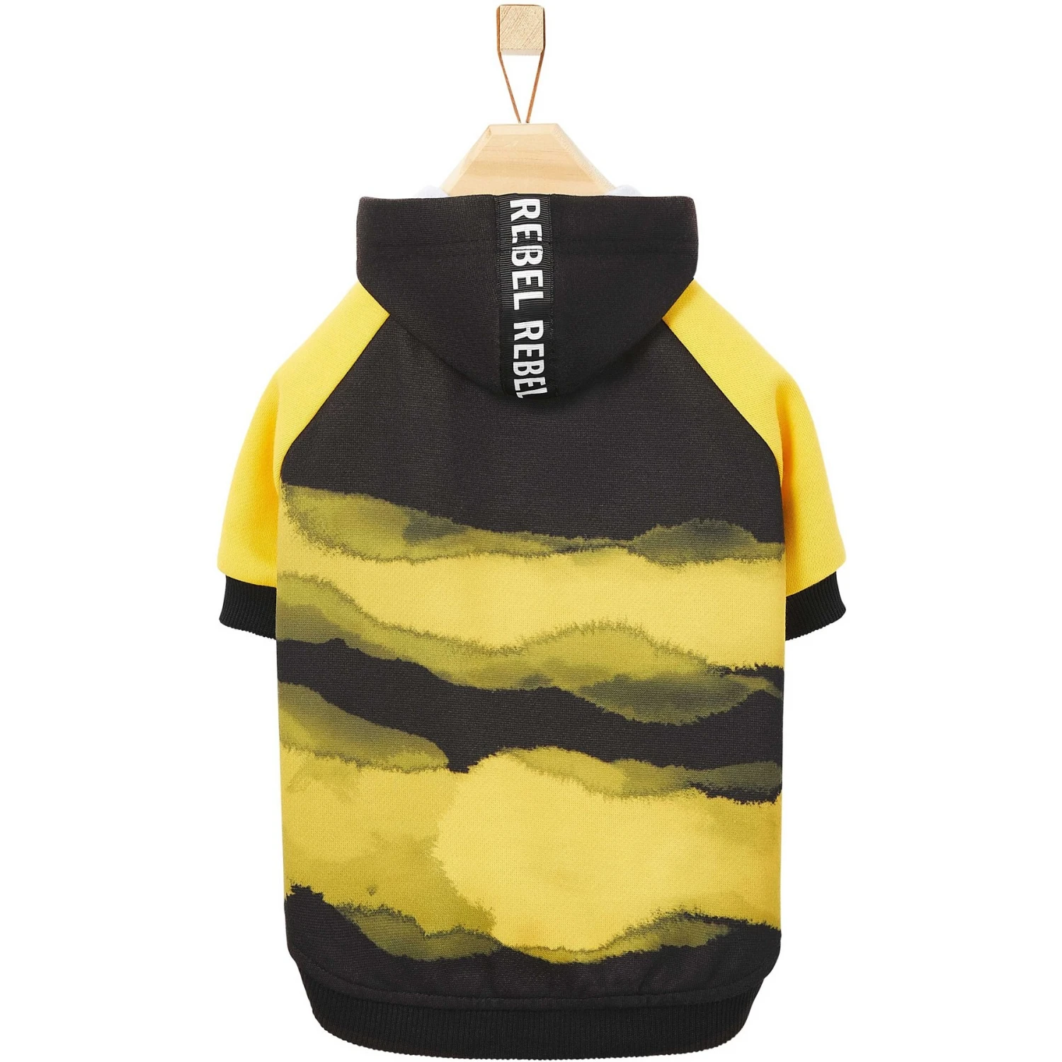 - Black and yellow watercolor design and “Rebel” printed ribbon along the hood for a street style flair.